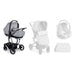 CARROZZINA: omologata per il trasporto in auto (0-10 kg), molto ampia, dotata di sistema di aggancio/sgancio rapido, con maniglione antiribaltamento, schienale reclinabile in 3 posizioni, materassino, modellistica sportiva, alzatina frangivento, completamente foderata, fondo aerato, base a dondolo, borsa con fasciatoio.